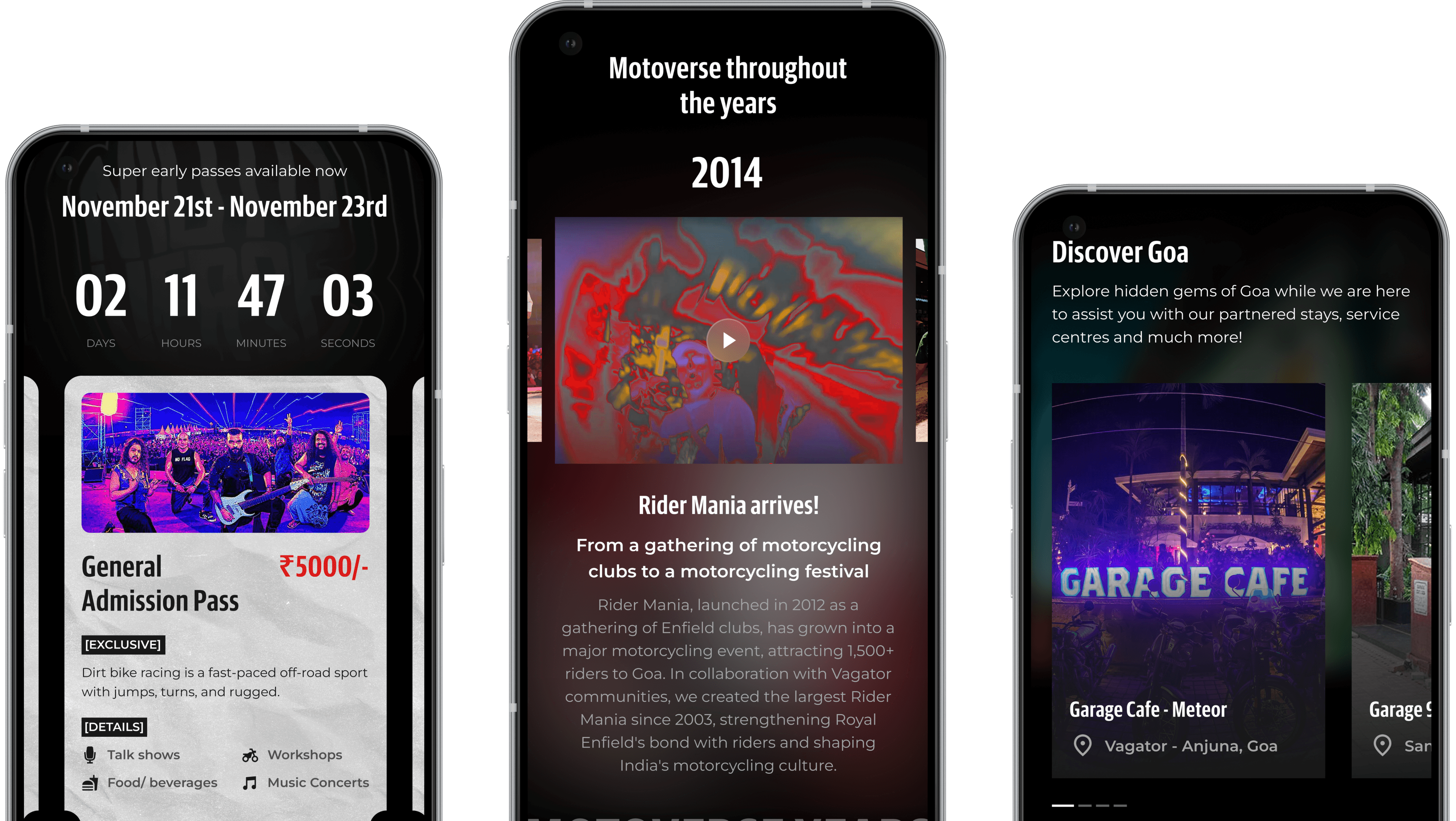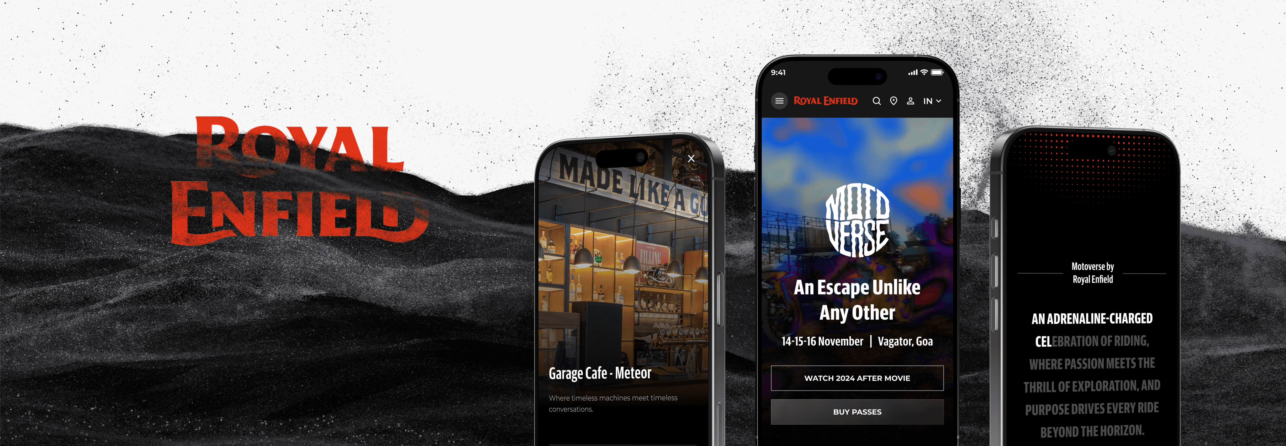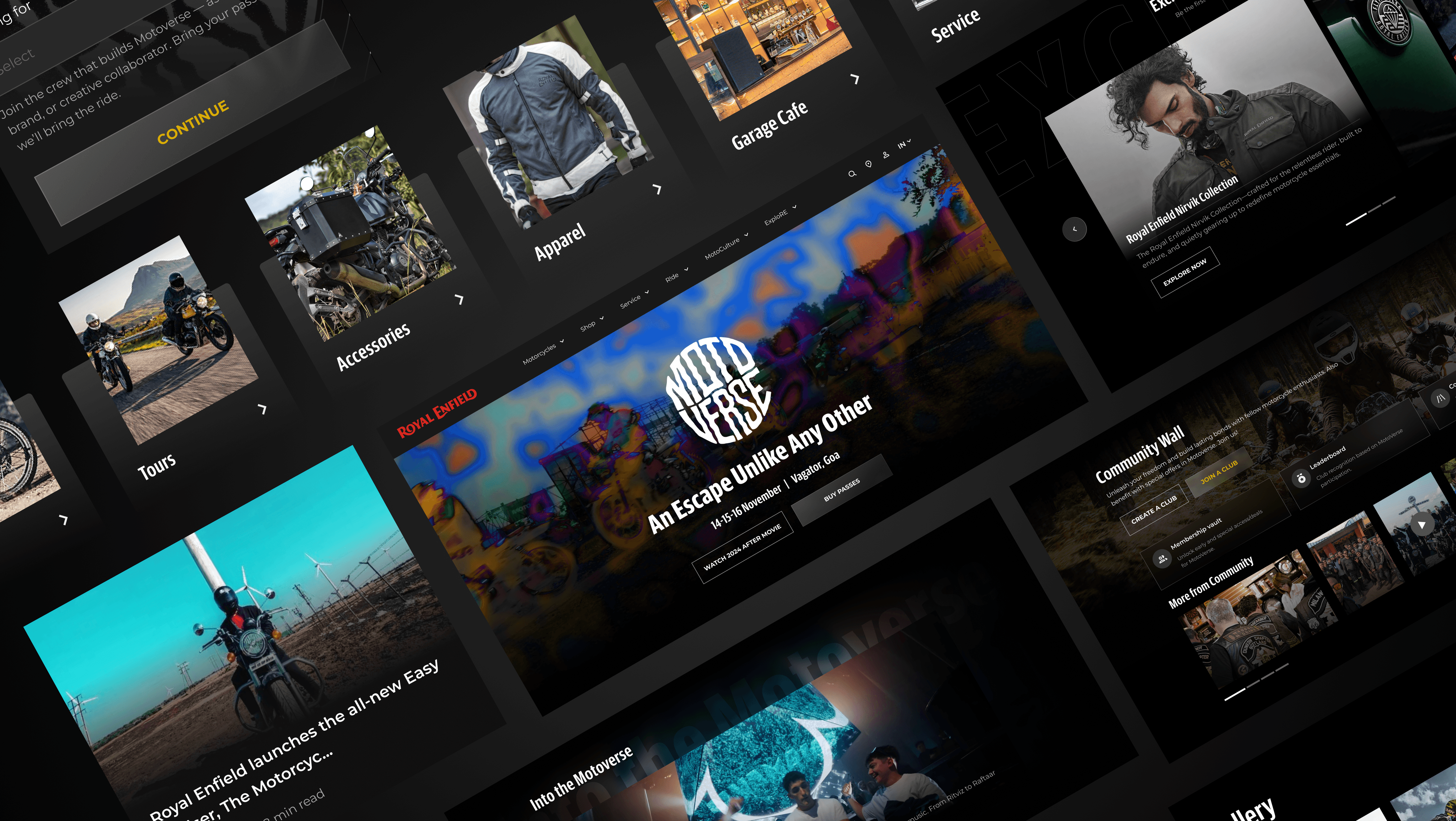 The goal is to capture and convey the true spirit of Motoverse — celebrating the adventure, activities, and excitement that await enthusiasts at the event. Given Royal Enfield's vast design ecosystem, which includes a range of existing modules and components, we have crafted the Motoverse page by thoughtfully integrating these elements while also creating new components that align with the theme. Each section has been designed to be visually engaging and meaningful, ensuring it reflects the essence of the experience it represents.